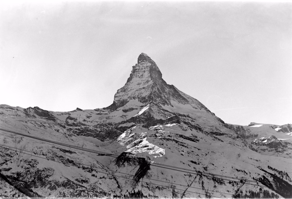 Black and white film photograph of the Matterhorn from Gornergrat, photographed with a 21mm Zeiss Distagon wide-angle lens