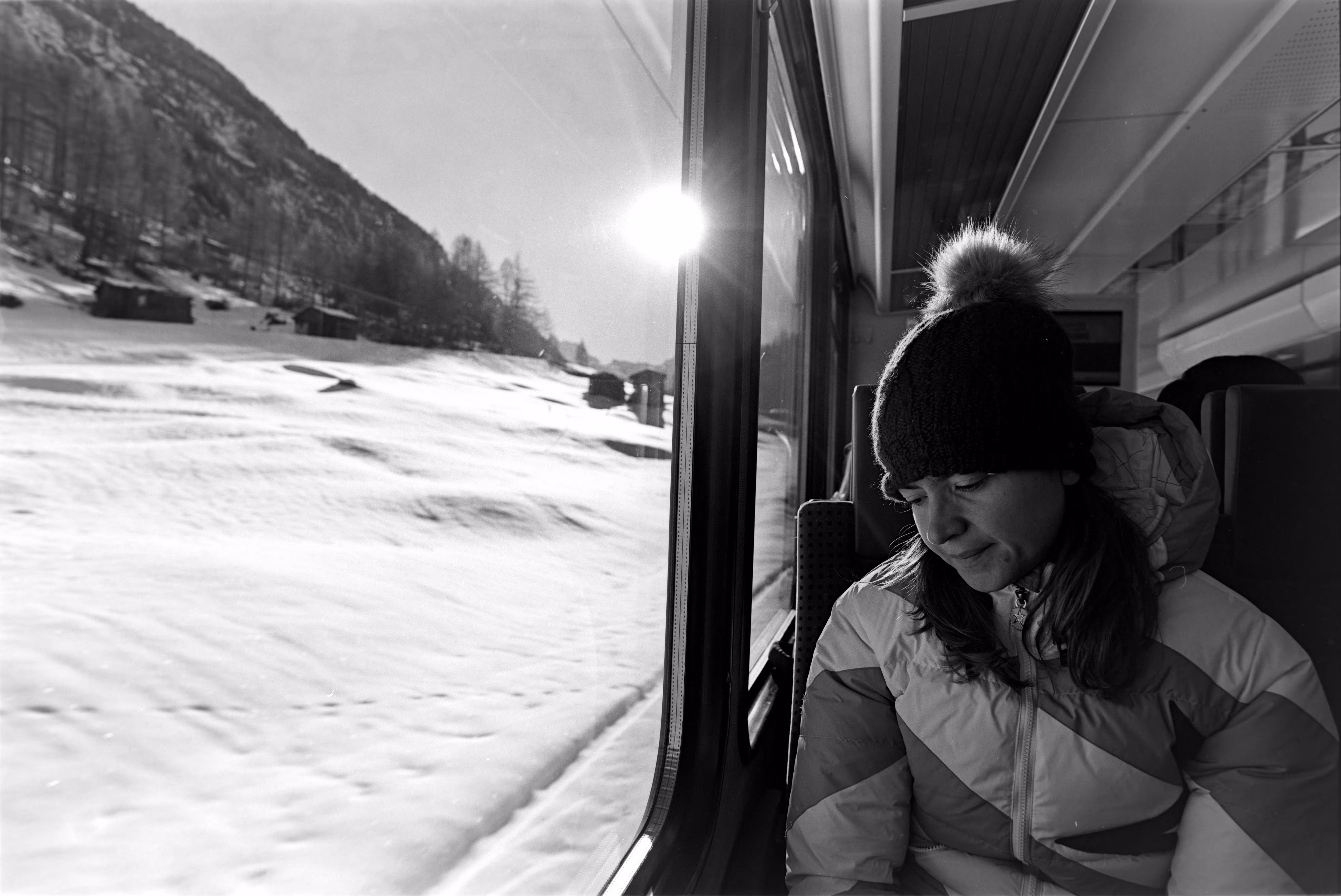 This photograph was taken of my sister while we were still on the train. After arriving at Zermatt Bahnhof, we boarded a second train bound for the Gornergrat Observatory. The cogwheel journey takes around 30 minutes, climbing from roughly 1,500 metres to over 3,100 metres above sea level.